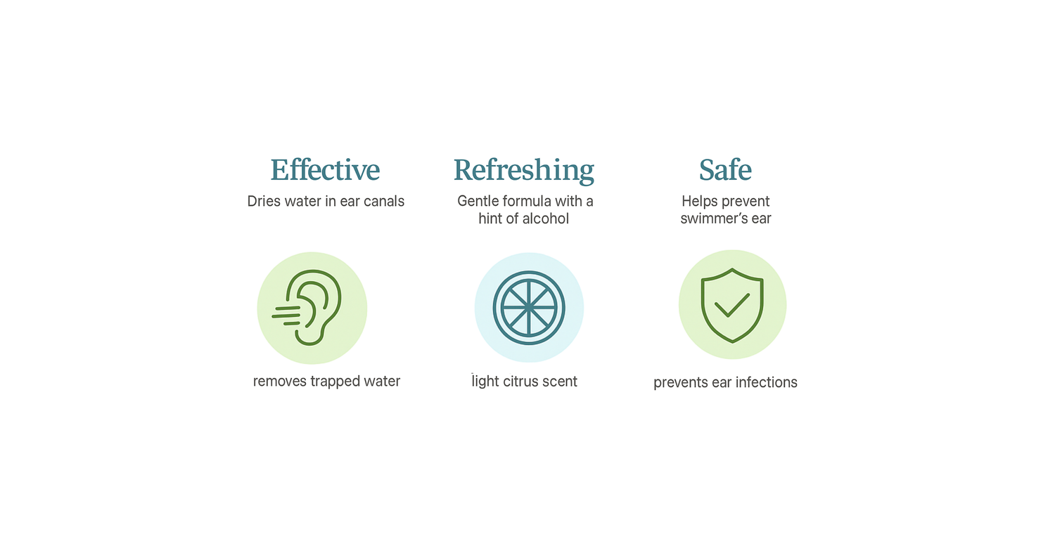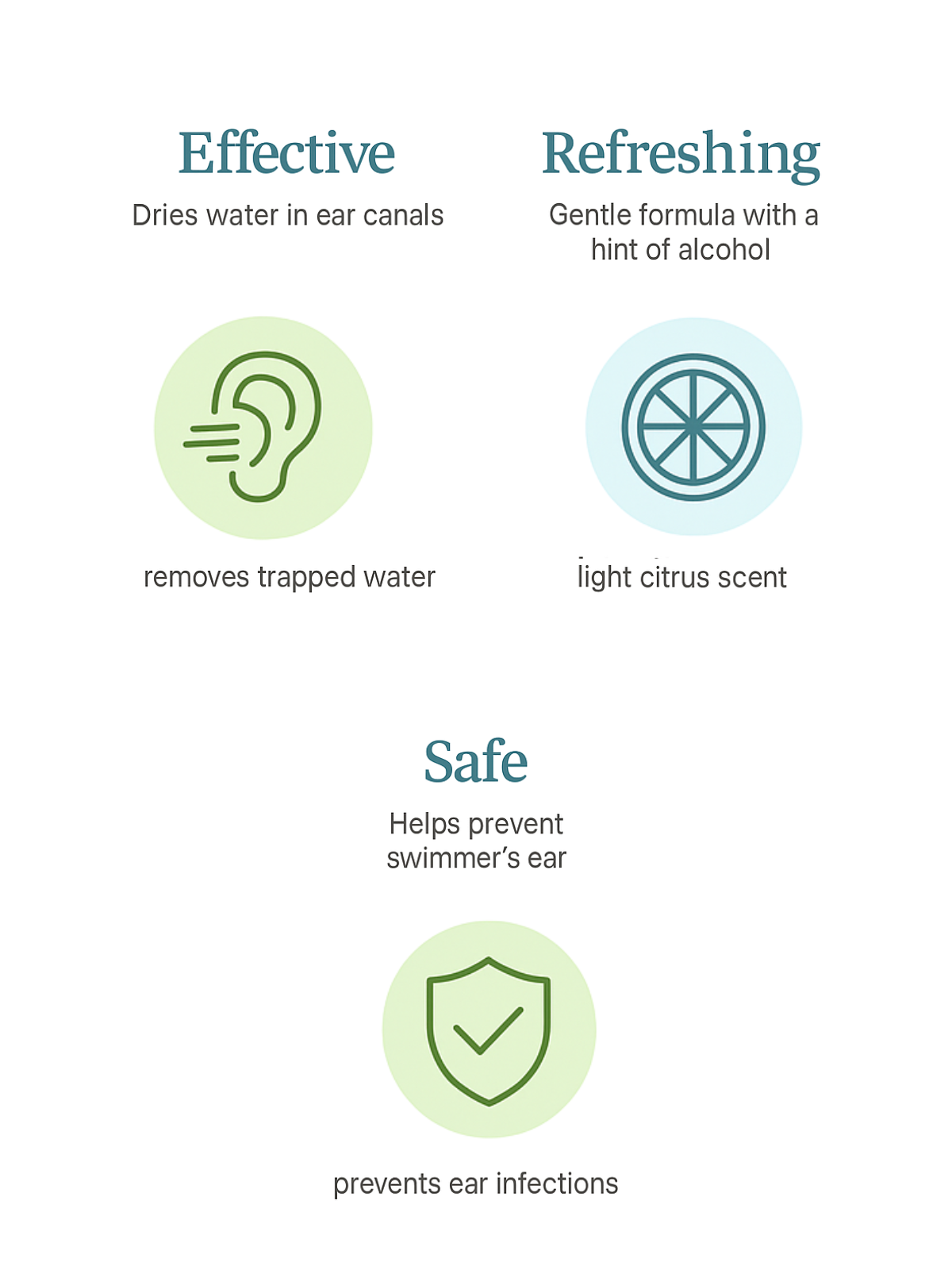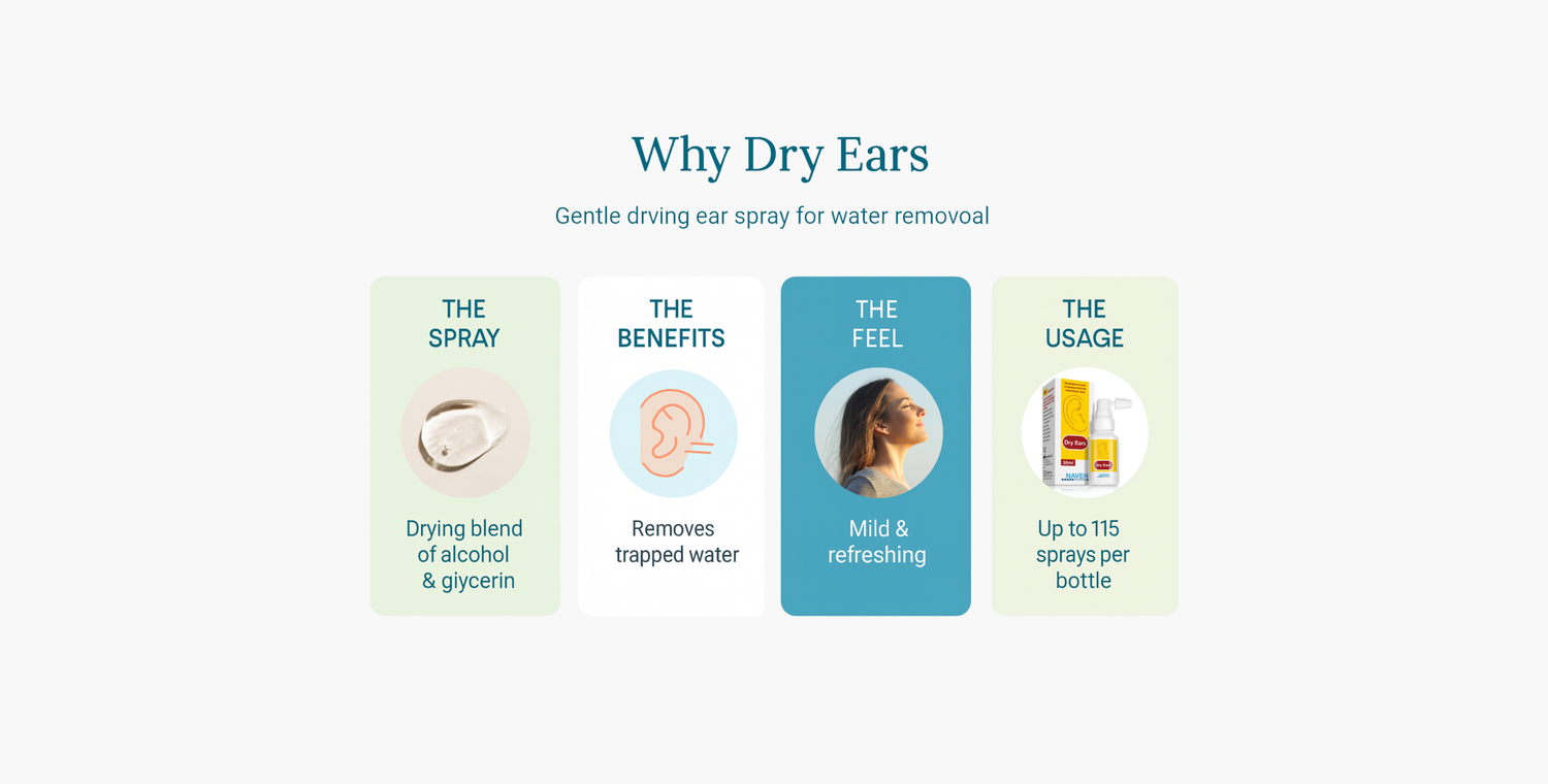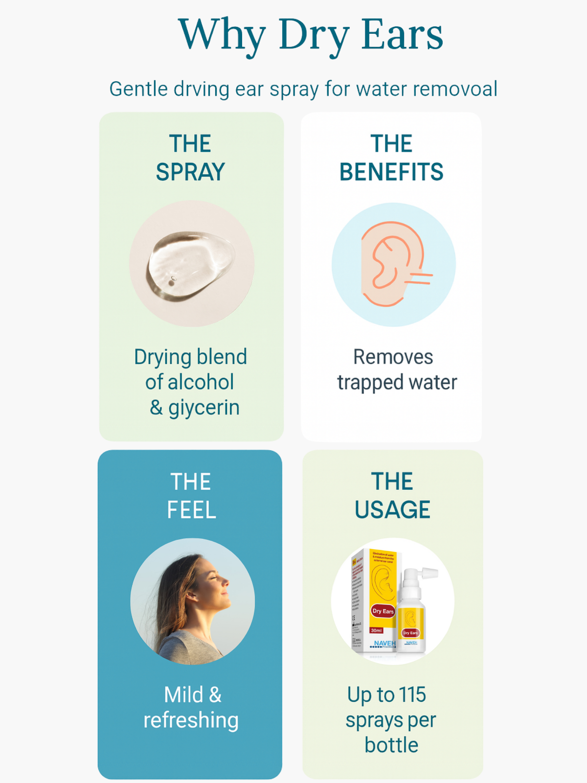 Dry Ears Spray is a fast-acting solution designed to remove trapped water from ears, perfect for swimmers and after showers. Choosing a spray for water displacement helps the treatment to cover effectively the inner ear canal which might be a bit difficult to achieve with the traditional drops.