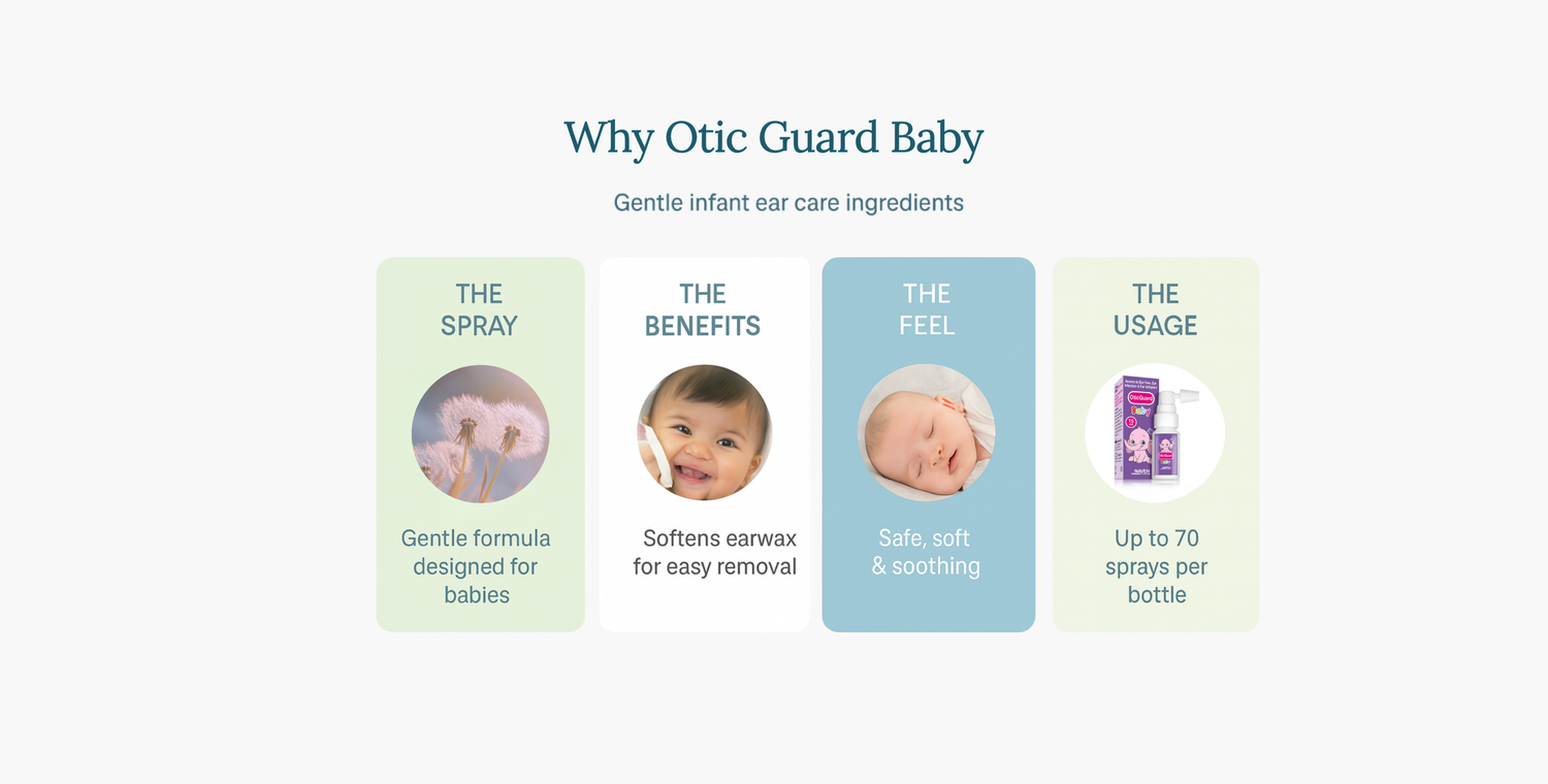 Otic Guard Baby is a gentle herbal ear oil designed to help with earwax removal and soothe irritation. Choosing a spray over the traditional ear drops helps make a safe, non-invasive way of delivery a much more pleasant and effective treatment for babies.