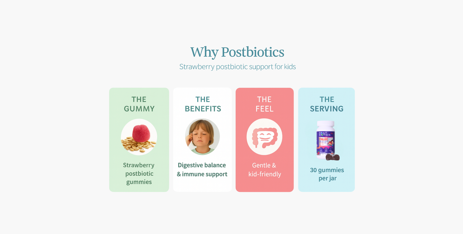Postbiotics Kids is a strawberry-flavored gummy supplement designed to support children's digestive health and immune system. With 60 gummies per bottle, it's a delicious and convenient way to promote a healthy gut microbiome.