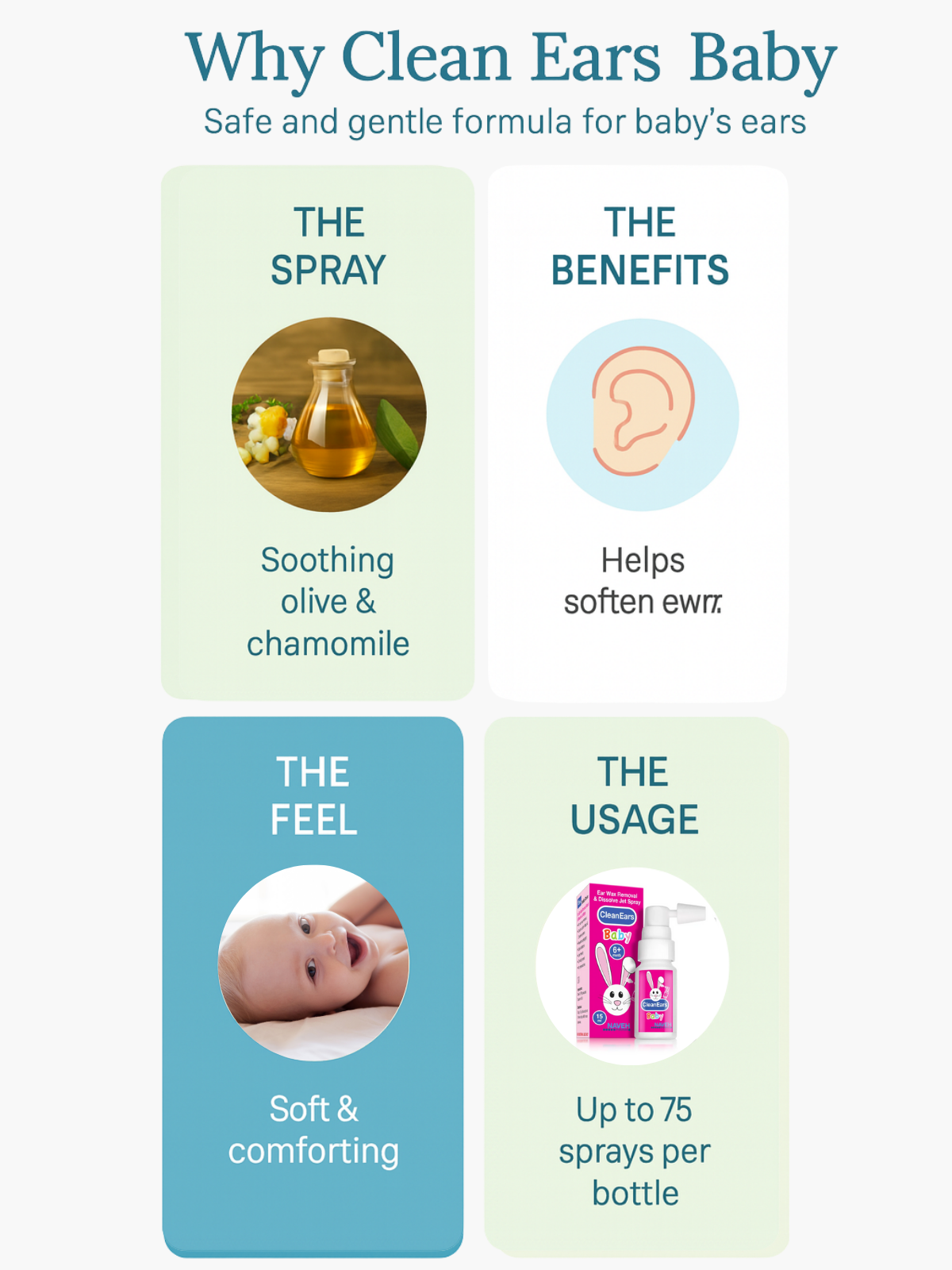CleanEars Baby is a gentle, mineral oil-based ear spray designed to dissolve earwax and maintain hygiene for infants and young children. Choosing a spray instead of the traditional drops helps the treatment cover the inner ear canal which might be a bit difficult to achieve with babies who won't sit still.