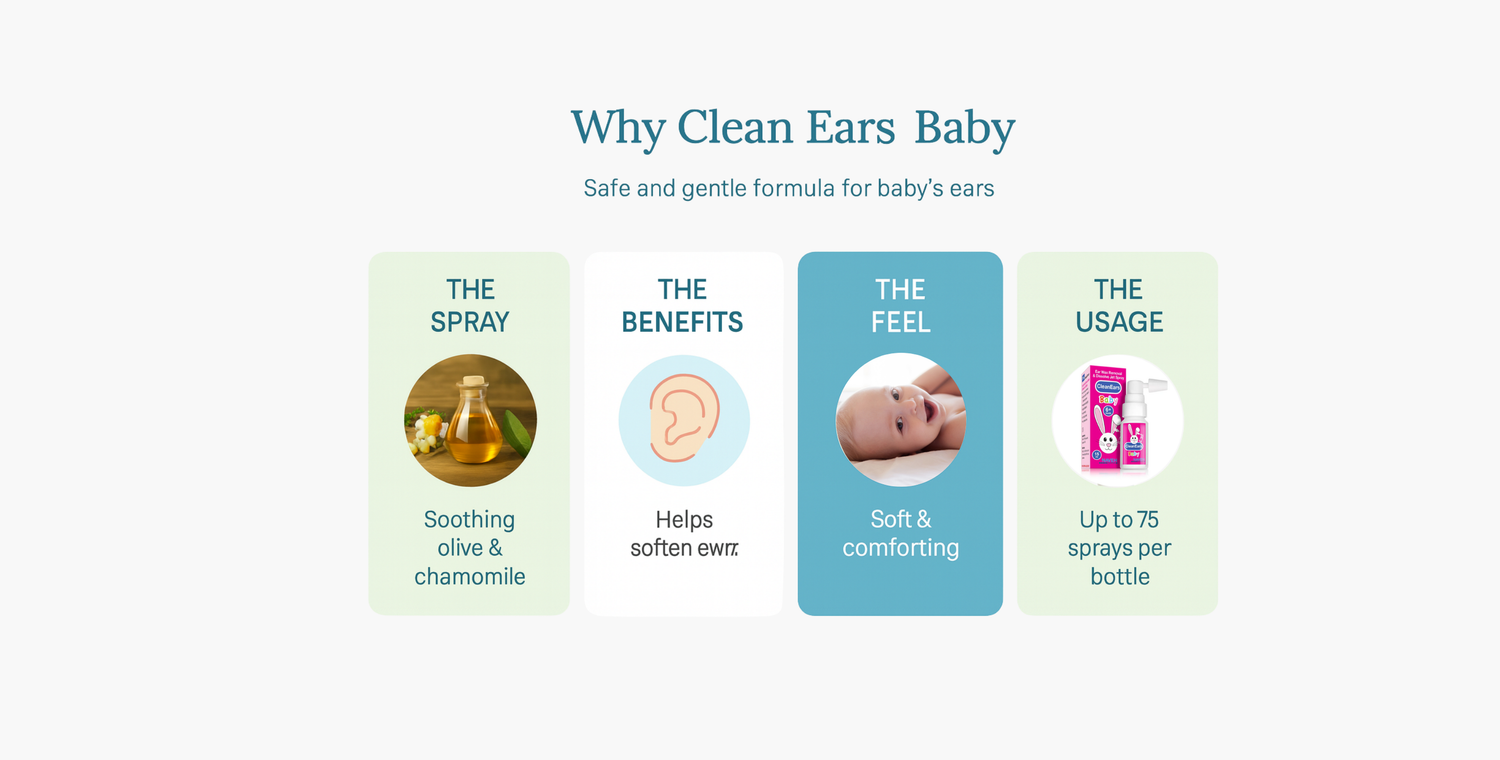 CleanEars Baby is a gentle, mineral oil-based ear spray designed to dissolve earwax and maintain hygiene for infants and young children. Choosing a spray instead of the traditional drops helps the treatment cover the inner ear canal which might be a bit difficult to achieve with babies who won't sit still.