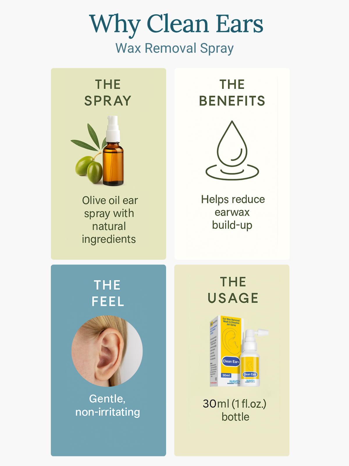CleanEars is an mineral oil-based ear spray designed to dissolve and remove earwax while maintaining ear hygiene.