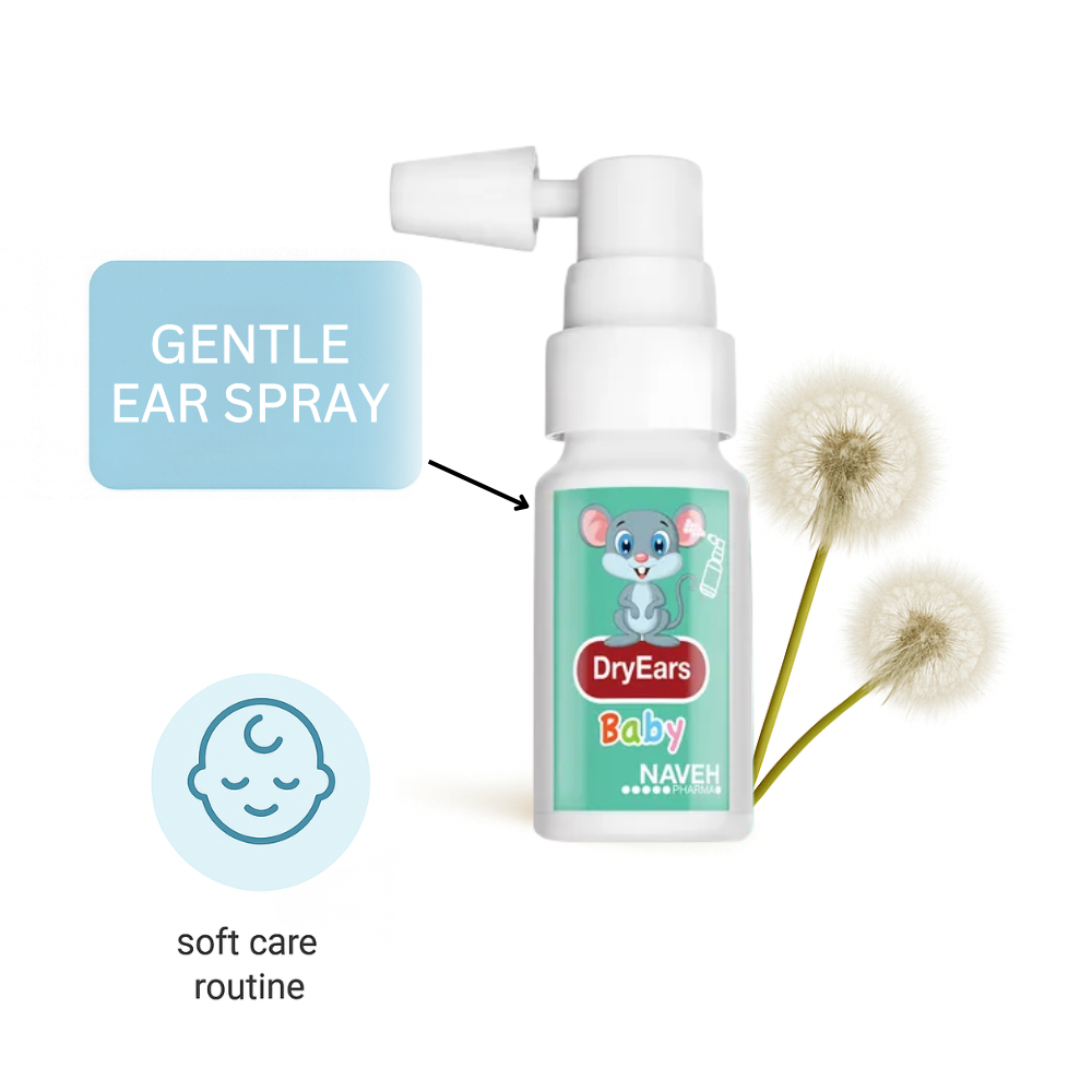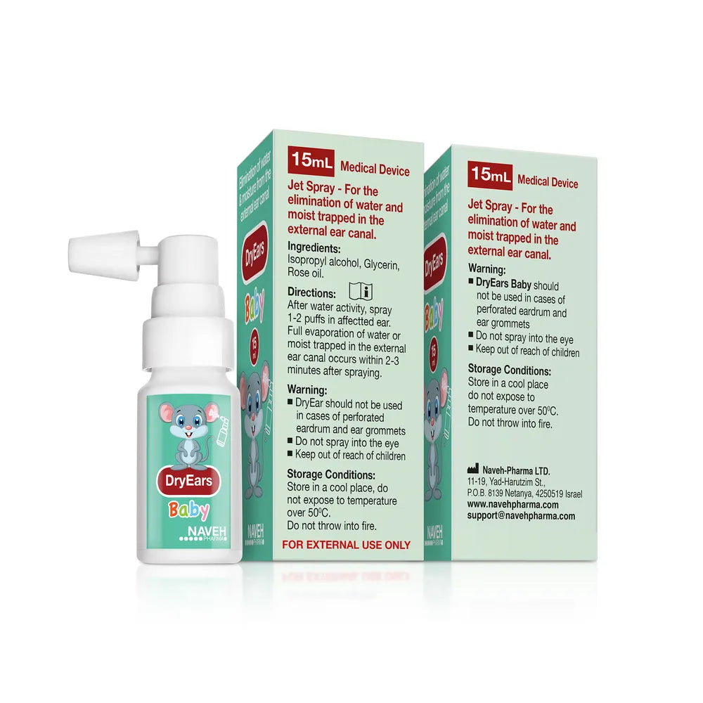 Dry Ears Baby is a gentle ear spray that removes water trapped in tiny ears, perfect for little swimmers or kids with chronic ear infections. Its formula is safe, effective, and non-irritating for delicate baby skin. Choosing a spray for water displacement helps the treatment to cover effectively the inner ear canal which might be a bit difficult to achieve with the traditional drops for babies who won't sit still.
