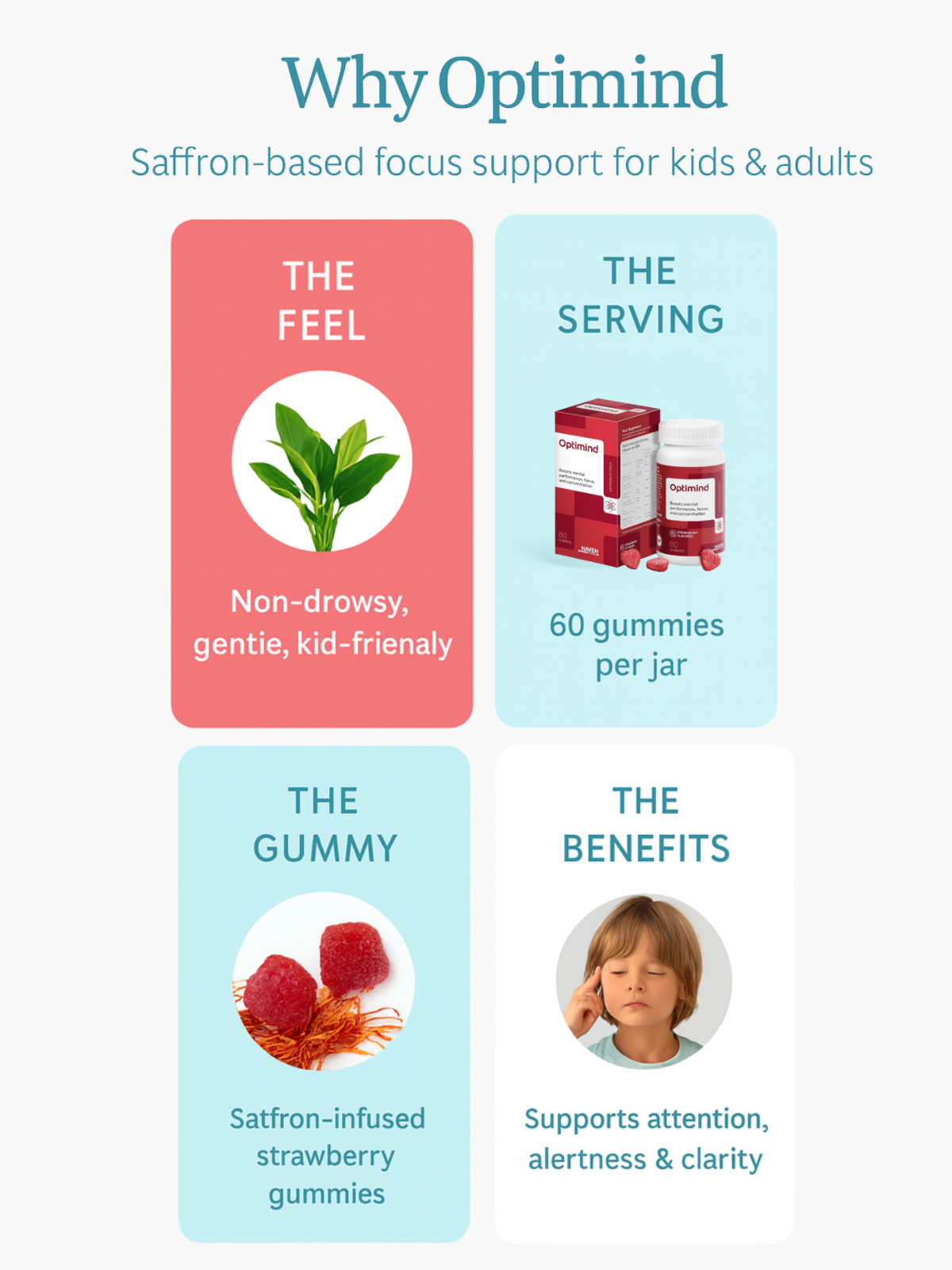 OptiMind is a strawberry-flavored gummy supplement infused with saffron, designed to support focus, energy, and a positive mood. Perfect for kids and adults, it’s a fun and tasty way to stay sharp and uplifted.
