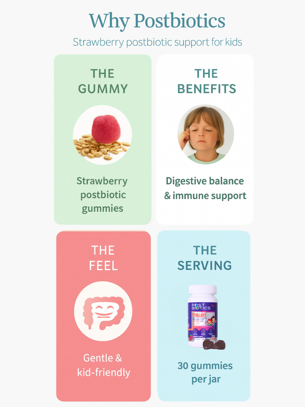 Postbiotics Kids is a strawberry-flavored gummy supplement designed to support children's digestive health and immune system. With 60 gummies per bottle, it's a delicious and convenient way to promote a healthy gut microbiome.