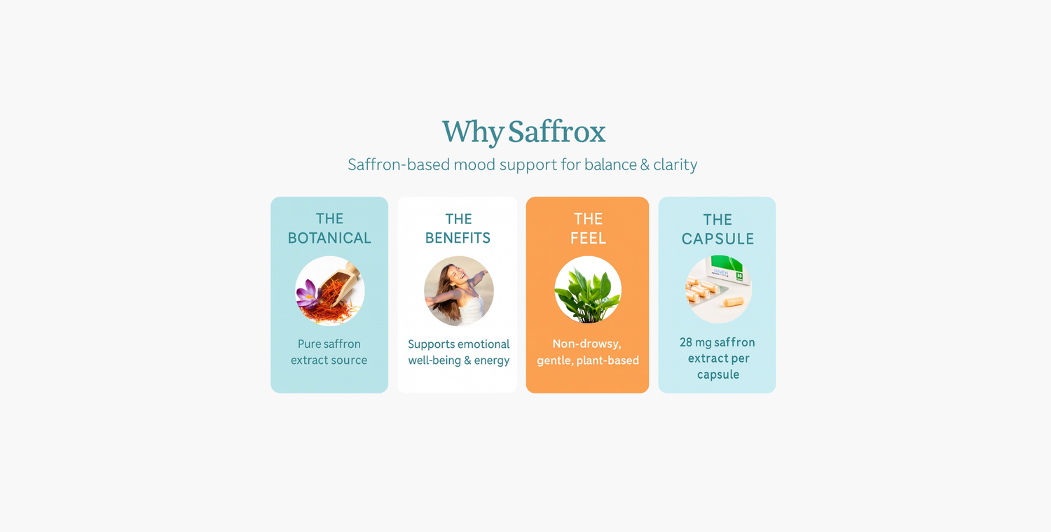 Saffrox is a natural mood support supplement featuring 28 mg of saffron extract per capsule. Designed for adults, it promotes emotional well-being and boosts energy levels.